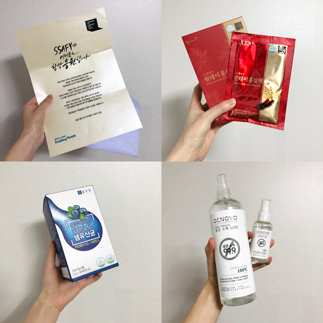 응원 메시지를 담은 편지(?)와 함께 홍삼, 유산균, 소독제 이렇게 세가지가 왔어요!