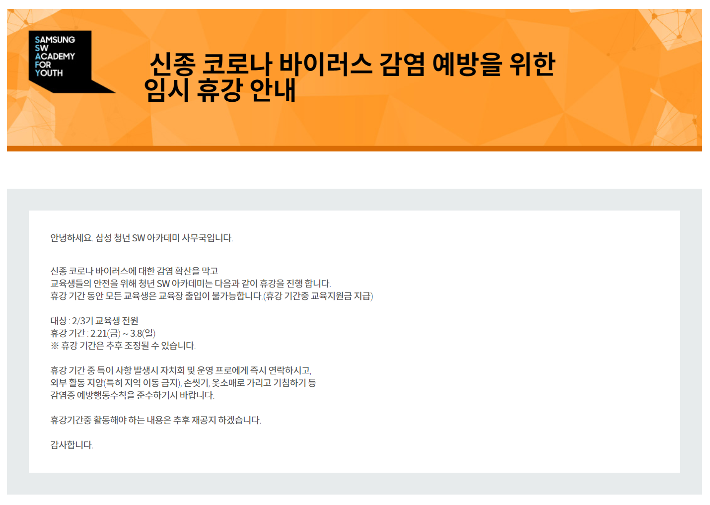 SSAFY 측에서는 발빠른 대처로 2주 휴강을 결정했습니다.