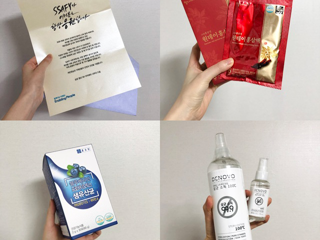며칠 뒤 집 앞에 택배 상자가 두둥! 바로 홍삼과 유산균, 그리고 소독제였어요.